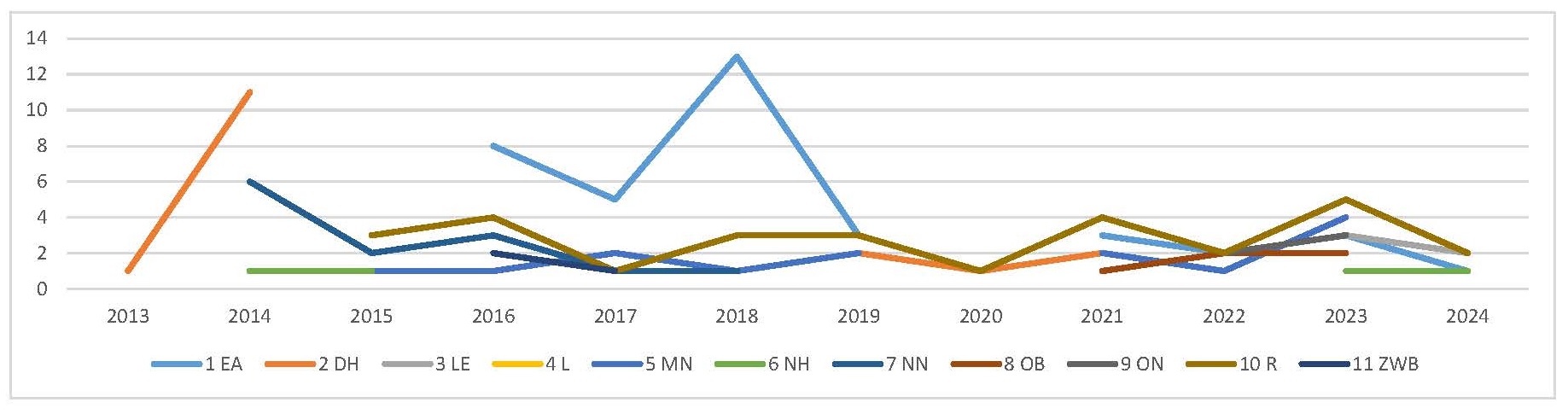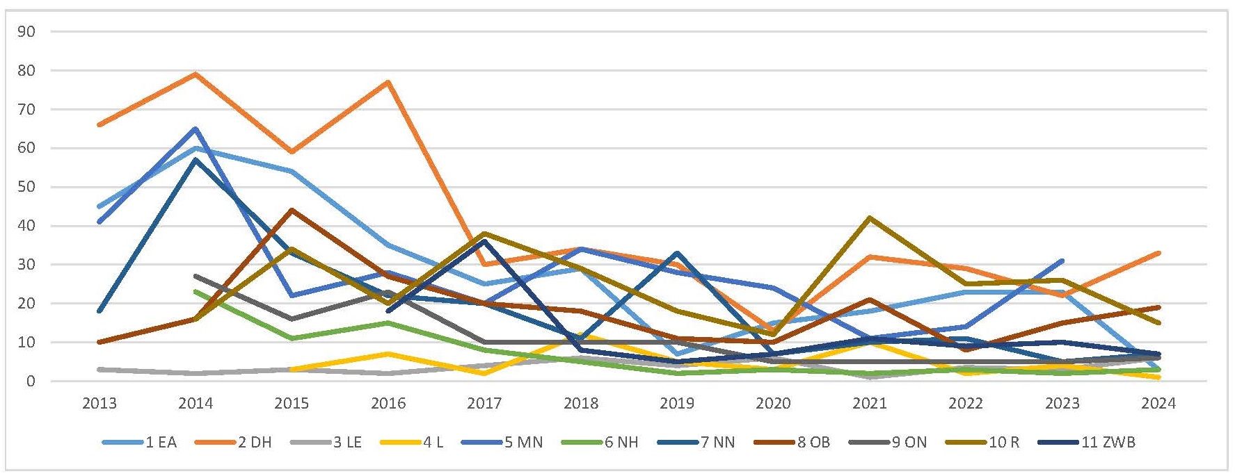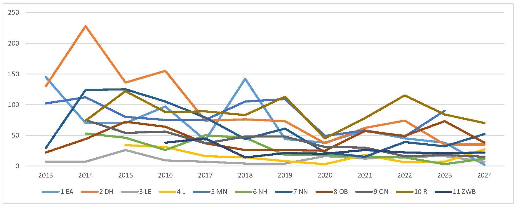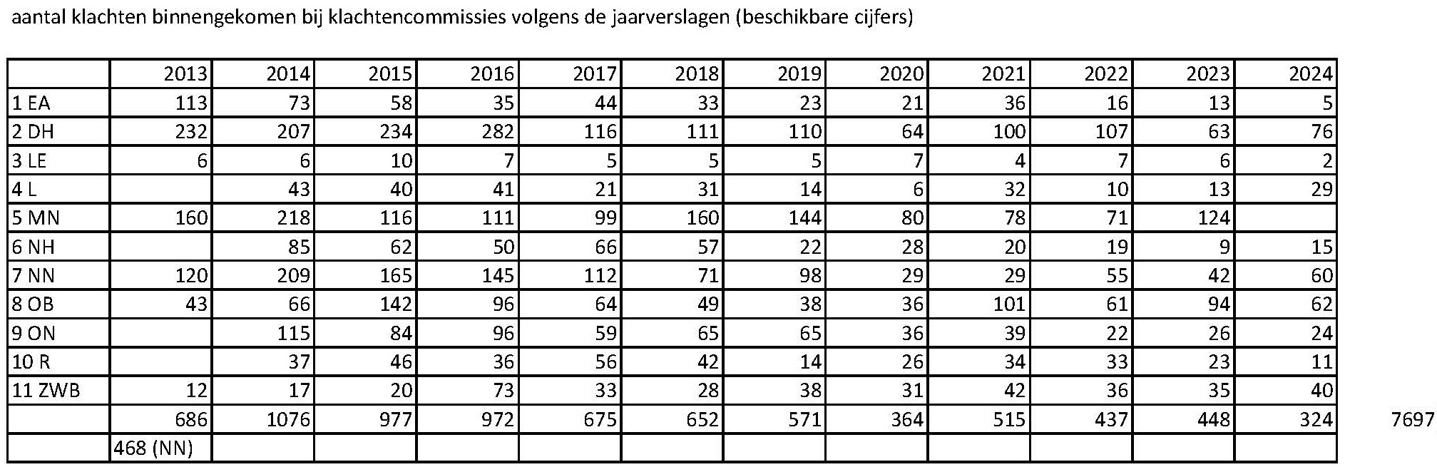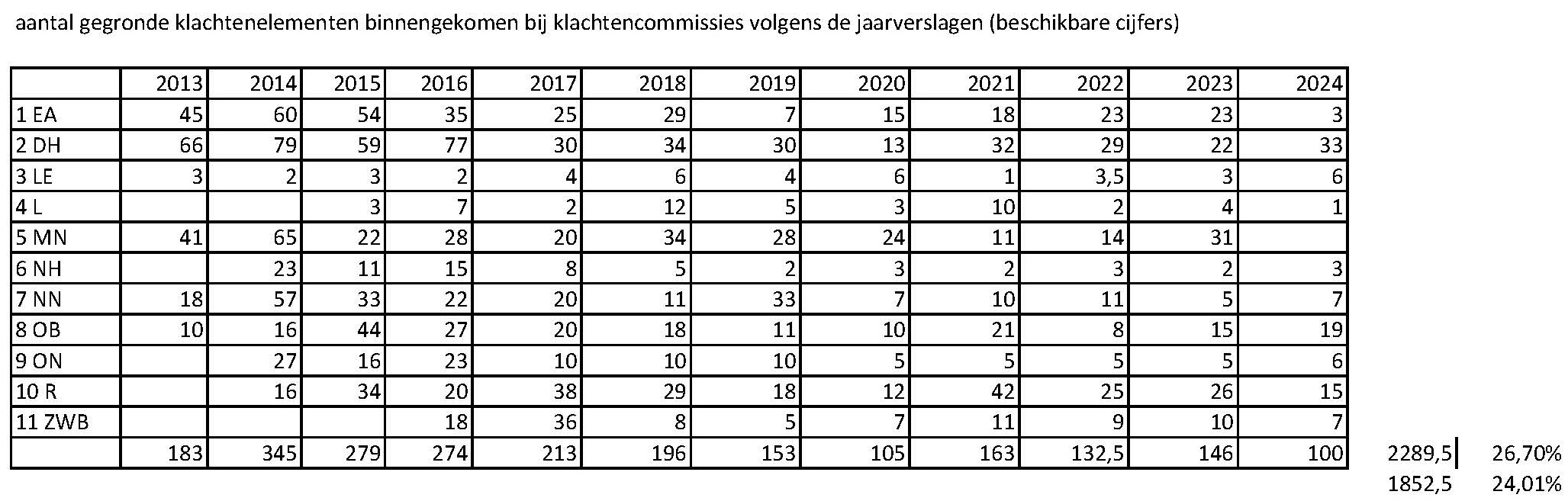 In de elf jaar die zijn onderzocht is dit de enige keer dat er een totaalcijfer is gepubliceerd, al moet gezegd worden dat het onduidelijk is waarop dit cijfer is gebaseerd, omdat in 2013 de cijfers van zeven politie-eenheden niet is verstrekt. In 2024 schreef de voorzitter van de klachtencommissie van Oost-Brabant, Mr C.J.G.M. (Kees) van der Weide, dat er in 2023 3.290 en in 2024 2.980 landelijk door de politie zijn afgedaan. Waar rechter van der Weide deze cijfers op baseert is niet duidelijk. In 2023 publiceerden twee regio’s het aantal klachten en in 2024 één regio. In 2023 was het aantal van die twee regio’s Rotterdam en Oost-Brabant, 2.590 en zouden de andere negen regio’s slechts 700 klachten hebben ontvangen en in 2024 zouden de tien regio’s naast Rotterdam minder klachten ontvangen (1.251) dan Rotterdam zelf.