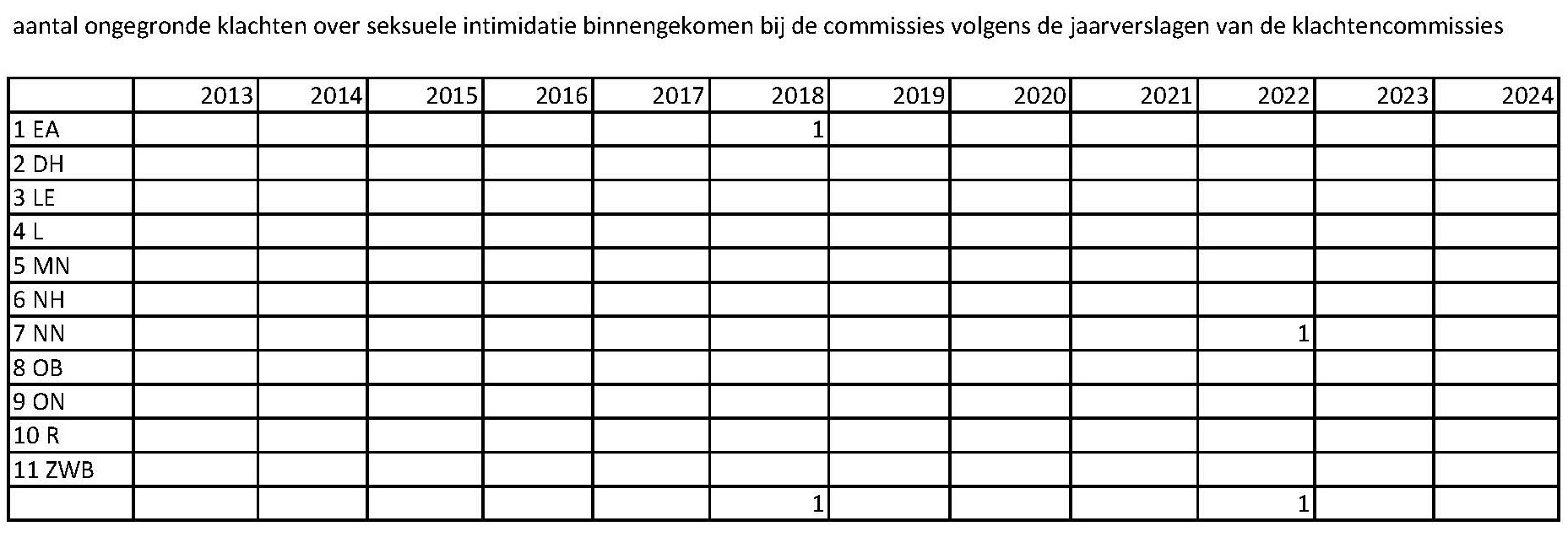 Aantal klachten over Seksuele intimidatie binnengekomen bij de klachtencommissies en ongegrond verklaard door de commissies