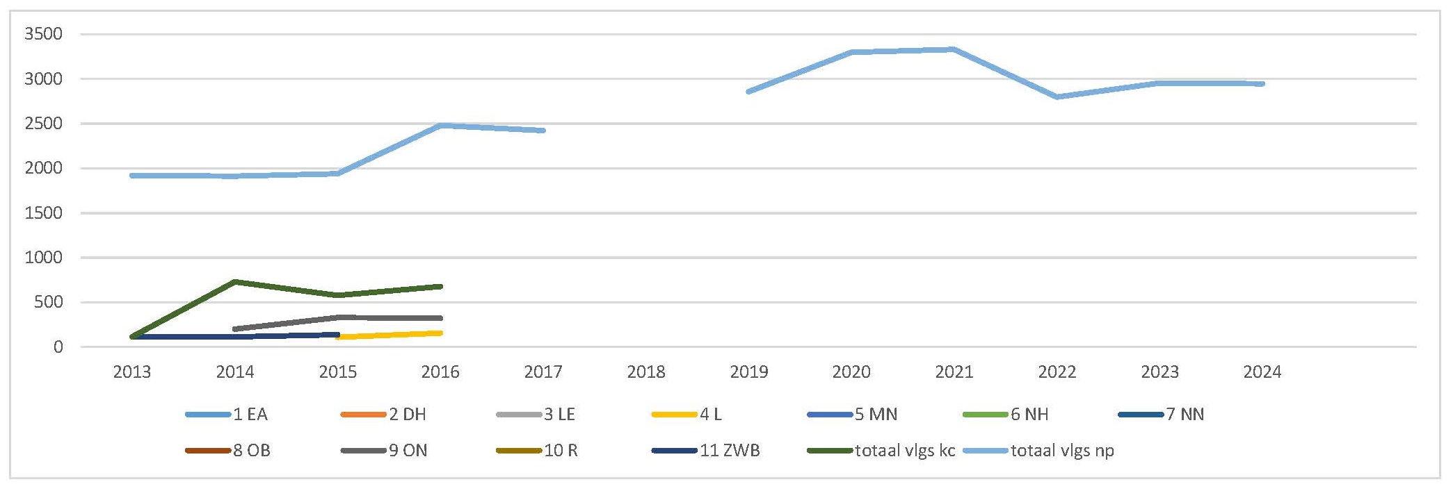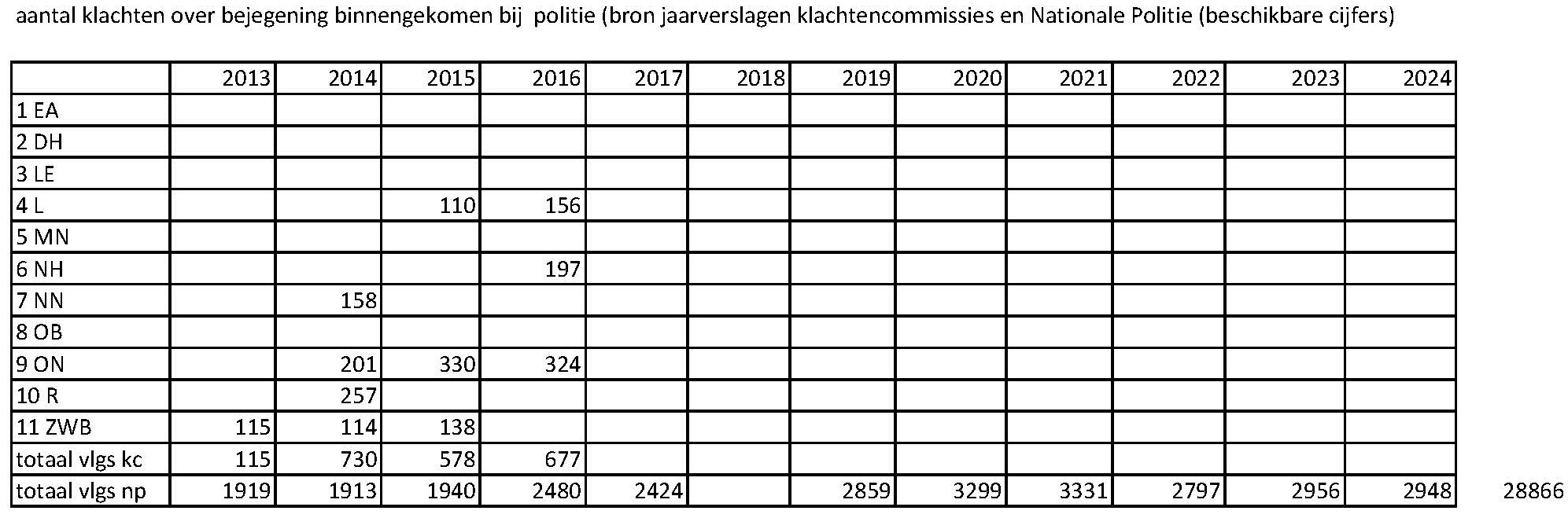 1 Eenheid Amsterdam, 2 Eenheid Den Haag, 3 Landelijke eenheid, 4 Eenheid Limburg, 5 Eenheid Midden-Nederland, 6 Eenheid Noord-Holland, 7 Eenheid Noord-Nederland, 8 Eenheid Oost-Brabant, 9 Eenheid Oost Nederland, 10 Eenheid Rotterdam, 11 Eenheid Zeeland West-Brabant, totaal vlgs kc (klachtencommissies), totaal  vlgs np (Nationale Politie)