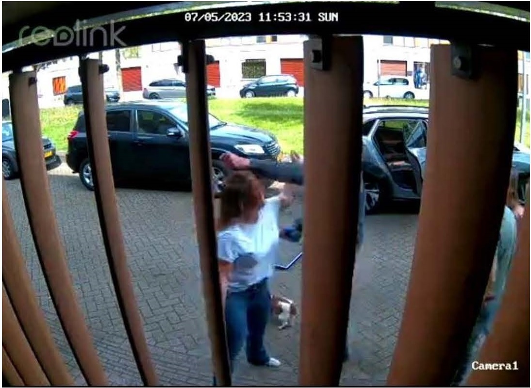 Een voorbeeld van één van de vele “duwen” van Jan Jaap de L. volgens politieonderzoek, de officier van justitie en de Advocaat-Generaal. Vol in mijn gezicht, terwijl ik met het gewonde hondje op de arm loop. Uiteraard ontbreekt dit ook in het camerabeeldverslag.