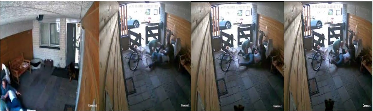 Kijkt u naar onderstaande beelden. Let daarbij op de weergegeven tijden in beeld. Om 11.52.46 viel ik. Ik sta ook direct weer op. U ziet linksboven dat Diana S. 11.52.47 de deur uitkomt. U ziet dat ik overeind kom, nergens stompende bewegingen maak en alweer sta, vóórdat Diana S. (11.52.48) bij me is. Net zoals politieagent Henri R., blijkt ook politieagent Diana S. aan hallucinaties te lijden of gewoon te liegen.