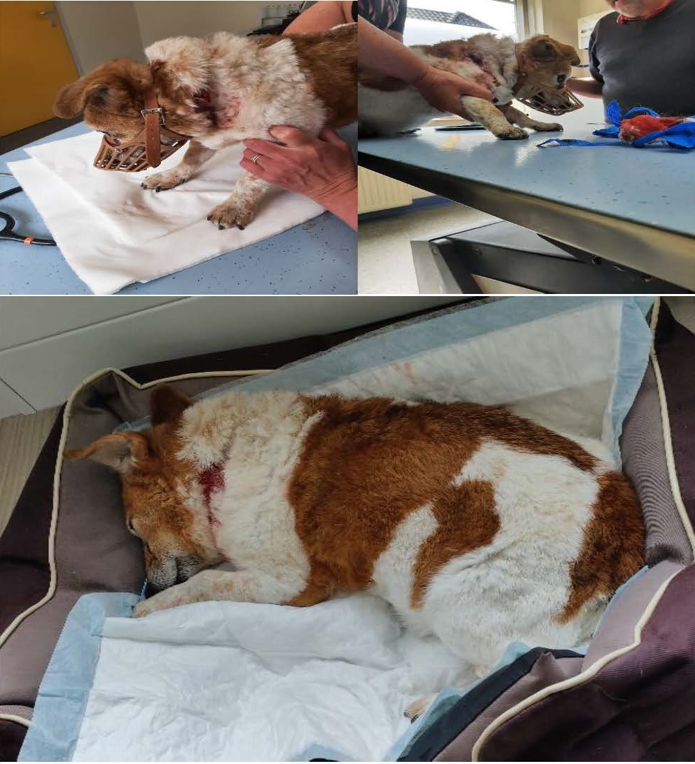 De hals van het diertje was aan beide kanten opengereten. Vol met hechtingen. Dierenarts vond het een wonder dat ze het overleefd had.